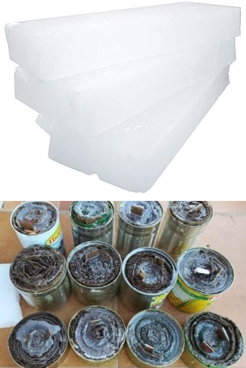 Температура плавлення парафіну – 59 С. Для максимальної безпеки можна плавити, опустивши ємкість з парафіном посудину з гарячою водою. Добре просочує картон та папір, максимально щільно заповнюючи посудину. Виготовлена свічка у бляшанці середнього розміру горить 3-4 год.